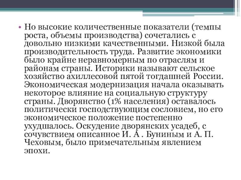 низкими качественными. Низкой была производительность труда. Развитие экономики было крайне неравномерным по отраслям и районам страны. Историки называют сельское хозяйство ахиллесовой пятой тогдашней России. Экономическая модернизация начала оказывать некоторое влияние на социальную структуру страны. Дворянство (1% населения) оставалось политически господствующим сословием, но его экономическое положение постепенно ухудшалось. Оскудение дворянских усадеб, с сочувствием описанное И. А . Буниным и А. П. Чеховым, было примечательным явлением эпохи.