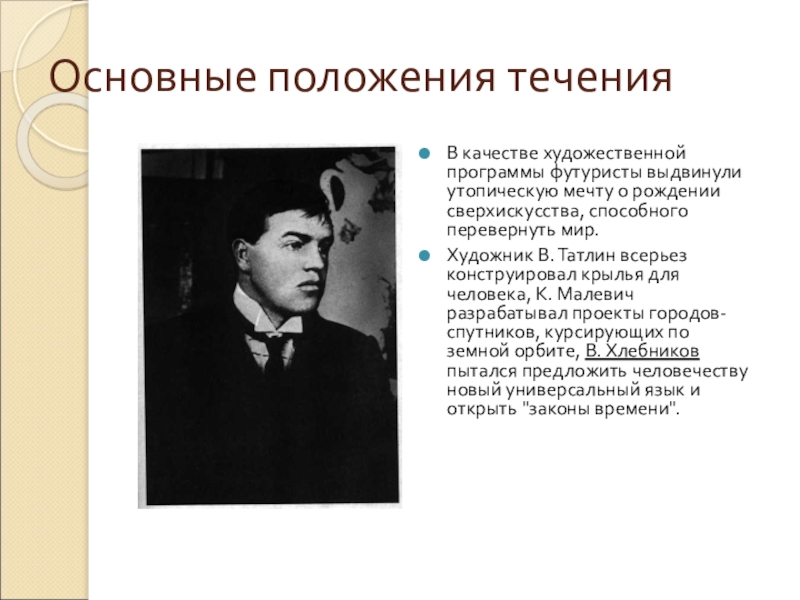 Художник В. Татлин всерьез конструировал крылья для человека, К. Малевич разрабатывал проекты городов-спутников, курсирующих по земной орбите, В. Хлебников пытался предложить человечеству новый универсальный язык и открыть "законы времени".