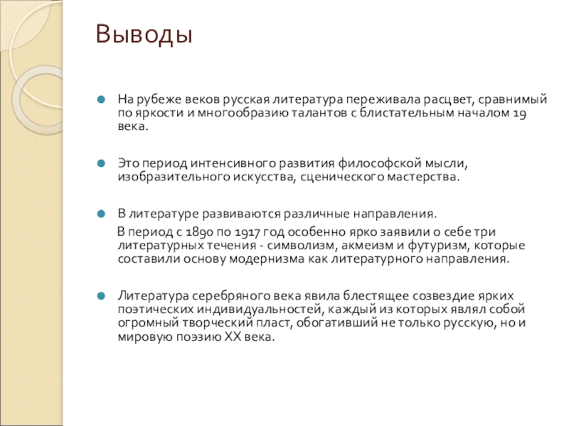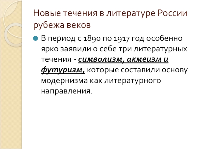 В период с 1890 по 1917 год особенно ярко заявили о себе три литературных течения - символизм, акмеизм и футуризм, которые составили основу модернизма как литературного направления.