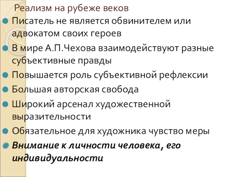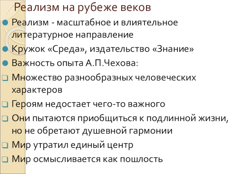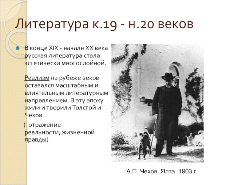 Реализм на рубеже веков оставался масштабным и влиятельным литературным направлением. В эту эпоху жили и творили Толстой и Чехов.
