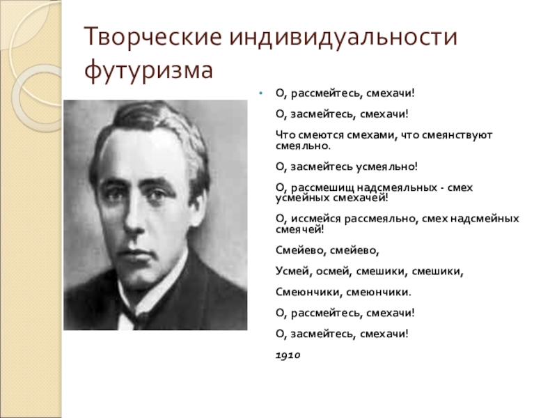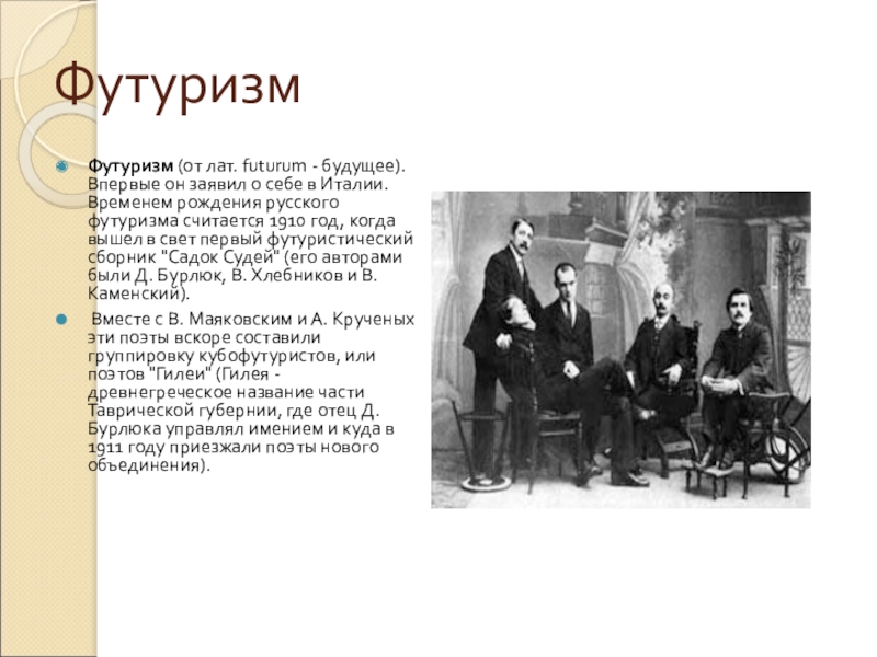 в Италии. Временем рождения русского футуризма считается 1910 год, когда вышел в свет первый футуристический сборник "Садок Судей" (его авторами были Д. Бурлюк, В. Хлебников и В. Каменский).