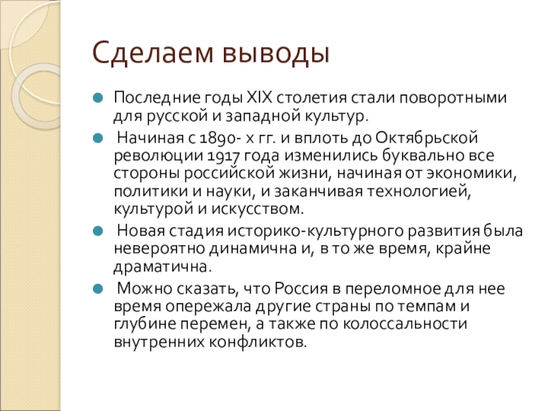 Можно сказать, что Россия в переломное для нее время опережала другие страны по темпам и глубине перемен, а также по колоссальности внутренних конфликтов.