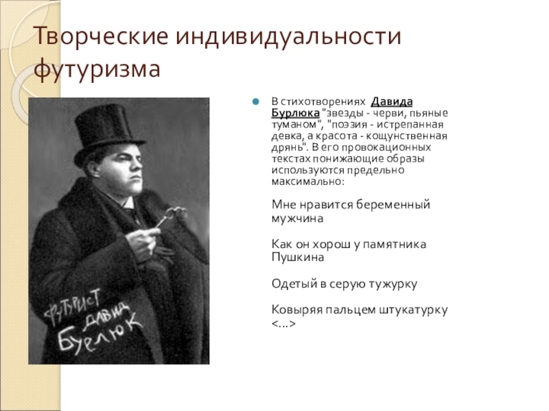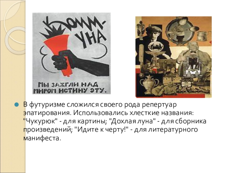 Слайд 31В футуризме сложился своего рода репертуар эпатирования. Использовались хлесткие названия: "Чукурюк"