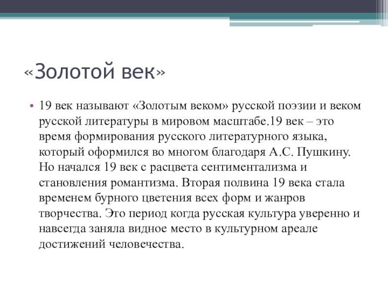 «Золотой век»19 век называют «Золотым веком» русской поэзии и веком русской литературы в мировом масштабе.19 век – это время формирования русского литературного языка, который оформился во многом благодаря А.С. Пушкину. Но начался 19 век с расцвета