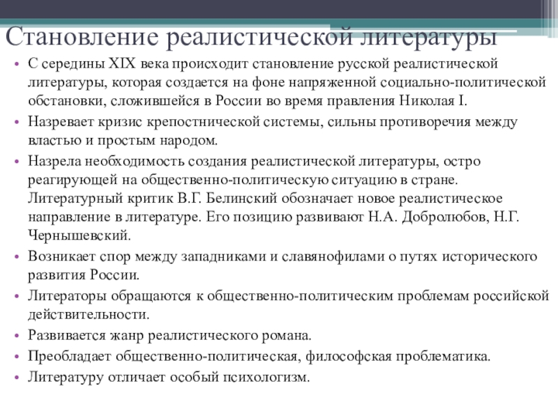 Назрела необходимость создания реалистической литературы, остро реагирующей на общественно-политическую ситуацию в стране. Литературный критик В.Г. Белинский обозначает новое реалистическое направление в литературе. Его позицию развивают Н.А. Добролюбов, Н.Г. Чернышевский.