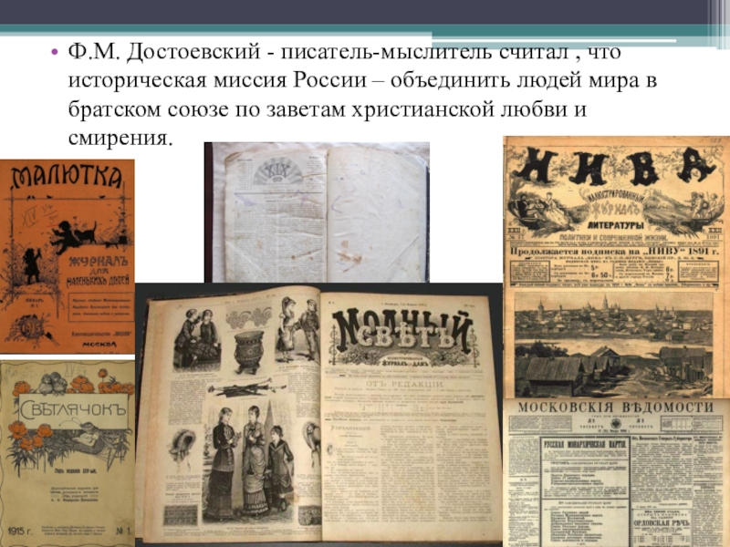 Ф.М. Достоевский - писатель-мыслитель считал , что историческая миссия России – объединить людей мира в братском союзе