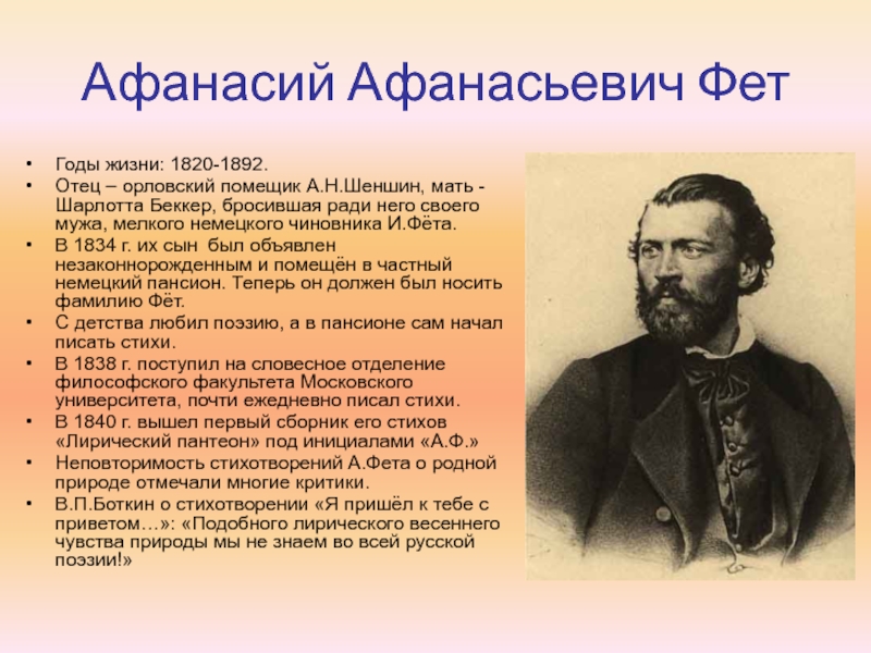 Отец – орловский помещик А.Н.Шеншин, мать -
