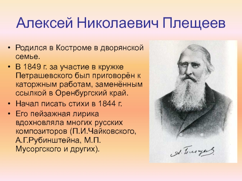 участие в кружке Петрашевского был приговорён к каторжным работам, заменённым ссылкой в Оренбургский край.
