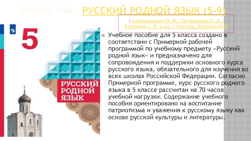 Учебное пособие для 5 класса создано в соответствии с Примерной рабочей программой по учебному предмету «Русский родной язык» и предназначено для сопровождения и поддержки основного курса русского языка, обязательного для изучения во всех школах Российской Федерации. Согласно Примерной программе, курс русского родного языка в 5 классе рассчитан на 70 часов учебной нагрузки. Содержание учебного пособия ориентировано на воспитание патриотизма и уважения к русскому языку как основе русской культуры и литературы.