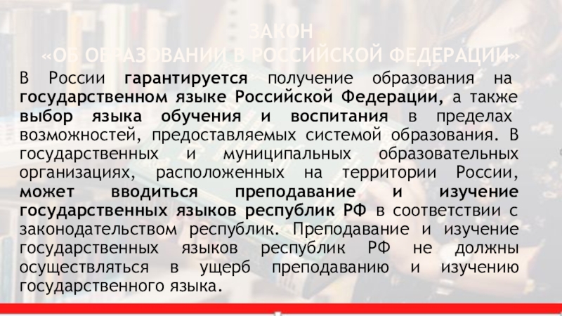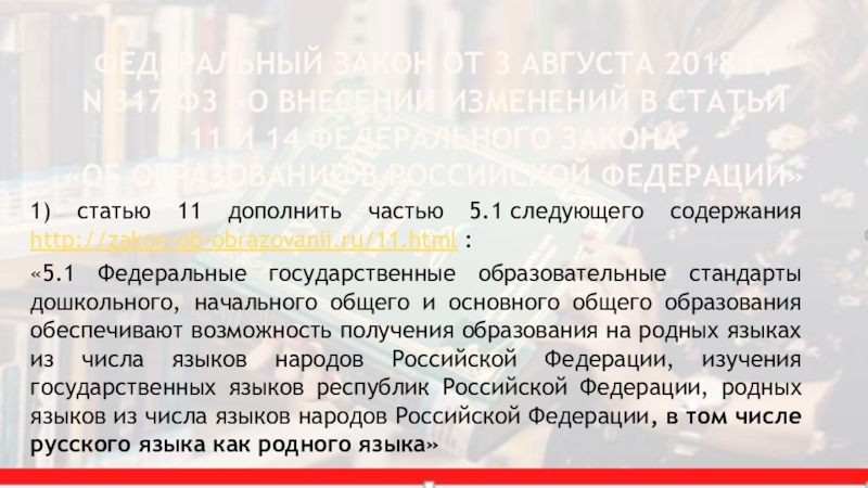 «5.1 Федеральные государственные образовательные стандарты дошкольного, начального общего и основного общего образования обеспечивают возможность получения образования на родных языках из числа языков народов Российской Федерации, изучения государственных языков республик Российской Федерации, родных языков из числа языков народов Российской Федерации, в том числе русского языка как родного языка»