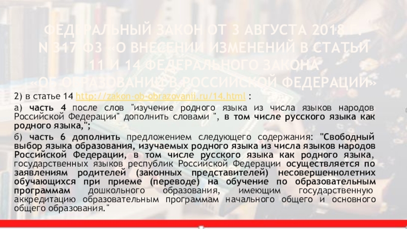б) часть 6 дополнить предложением следующего содержания: "Свободный выбор языка образования, изучаемых родного языка из числа языков народов Российской Федерации, в том числе русского языка как родного языка, государственных языков республик Российской Федерации осуществляется по заявлениям родителей (законных представителей) несовершеннолетних обучающихся при приеме (переводе) на обучение по образовательным программам дошкольного образования, имеющим государственную аккредитацию образовательным программам начального общего и основного общего образования."