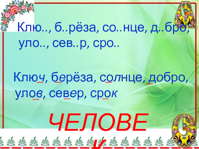 Клю.., б..рёза, со..нце, д..бро, уло.., сев..р, сро..