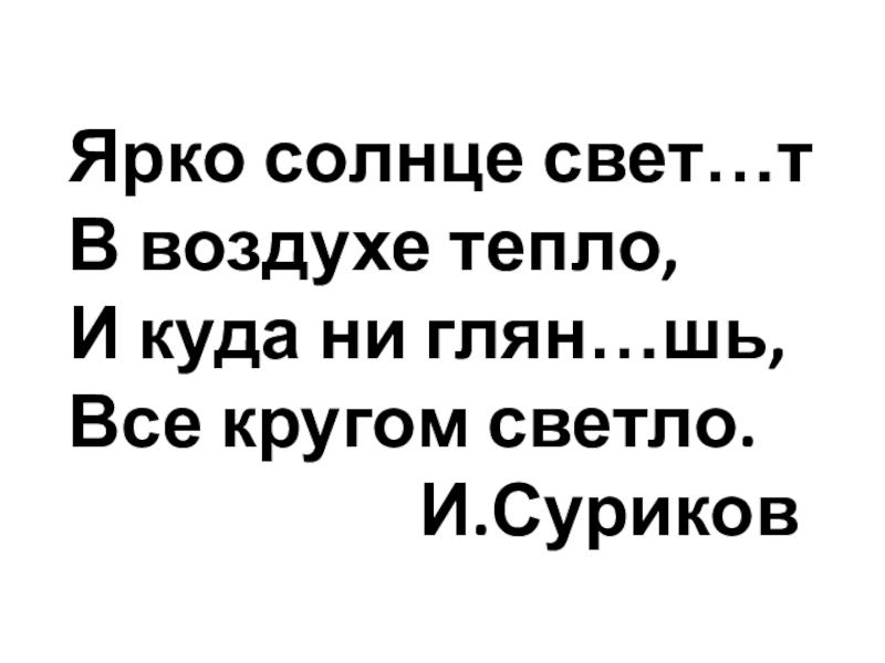 Слайд 5Ярко солнце свет…т В воздухе тепло, И куда ни глян…шь, Все кругом светло.