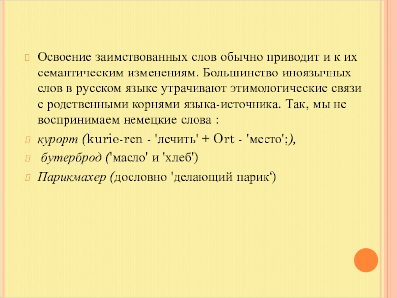 Слайд 14Освоение заимствованных слов обычно приводит и к их семантическим изменениям. Большинство
