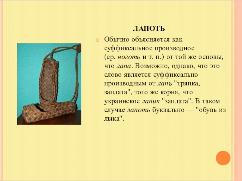 как суффиксальное производное (ср. ноготь и т. п.) от той же основы, что лапа. Возможно, однако, что это слово является суффиксально производным от лапъ "тряпка, заплата", того же корня, что украинское лапик "заплата". В таком случае лапоть буквально — "обувь из лыка".