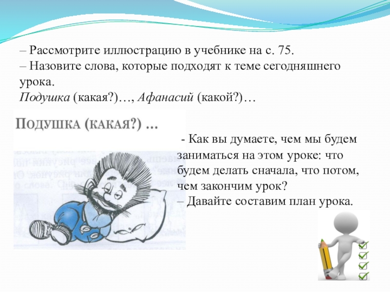 - Как вы думаете, чем мы будем заниматься на этом уроке: что будем делать сначала, что потом, чем закончим урок?