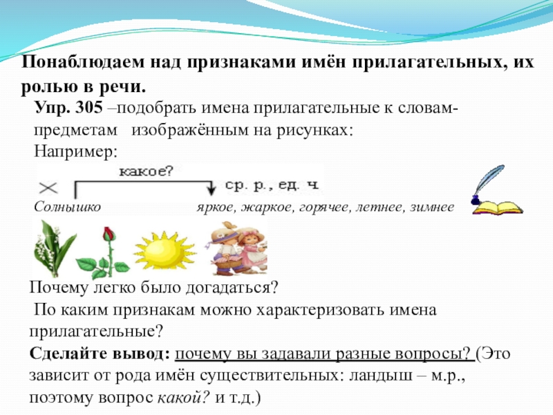 Понаблюдаем над признаками имён прилагательных, их ролью в речи.