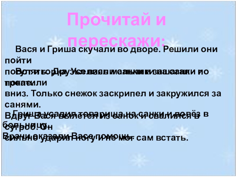 Гриша усадил товарища на санки и повёз в больницу.