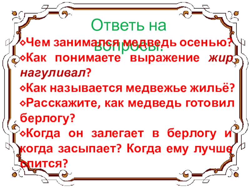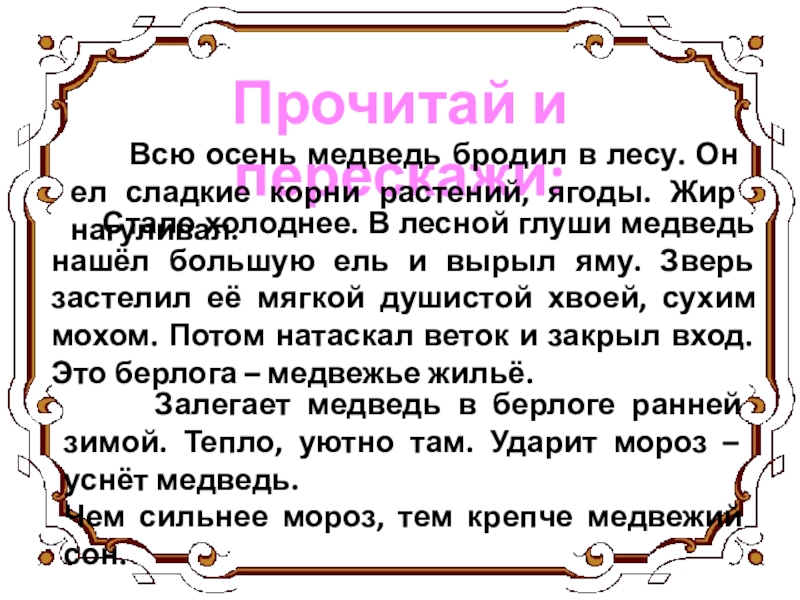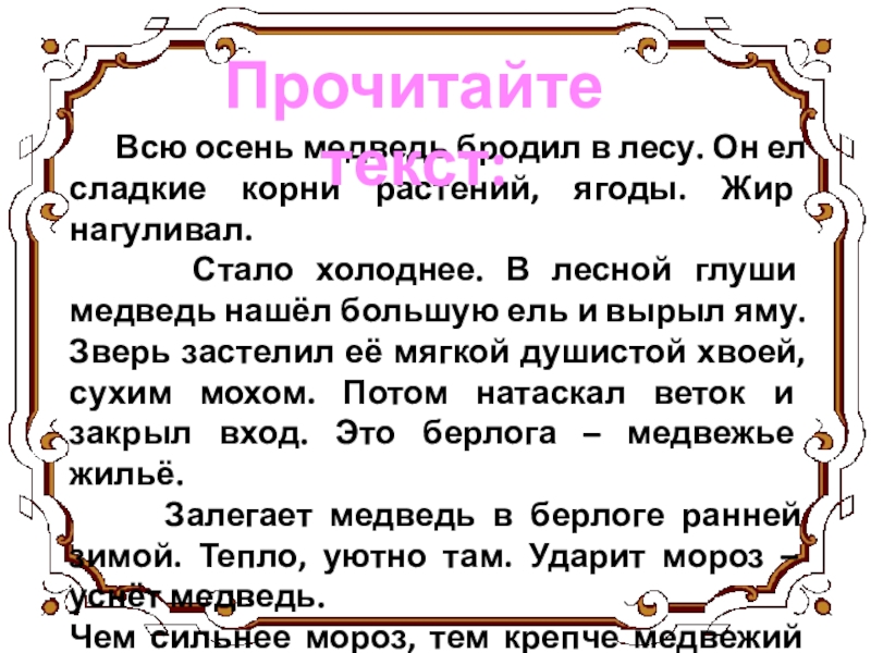 Залегает медведь в берлоге ранней зимой. Тепло, уютно там. Ударит мороз – уснёт медведь.
