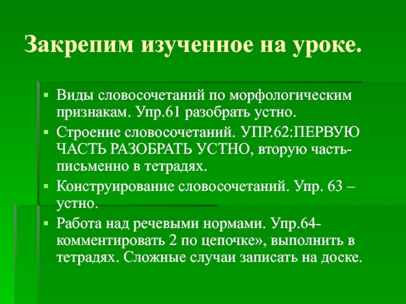 словосочетаний. УПР.62:ПЕРВУЮ ЧАСТЬ РАЗОБРАТЬ УСТНО, вторую часть- письменно в тетрадях.