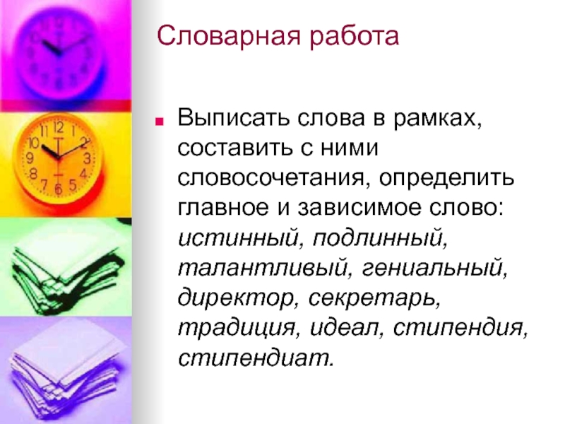 и зависимое слово: истинный, подлинный, талантливый, гениальный, директор, секретарь, традиция, идеал, стипендия, стипендиат.