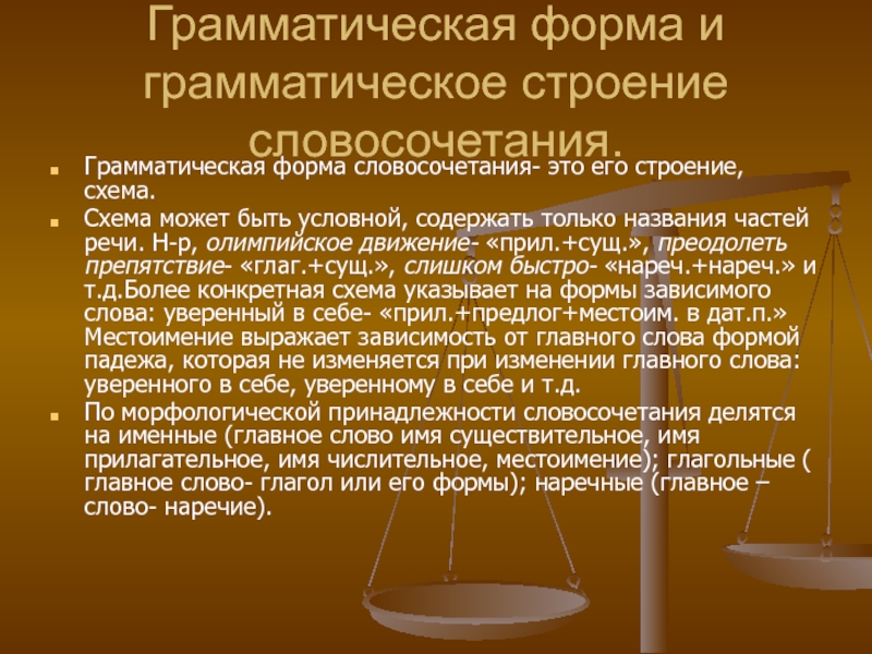 Слайд 8Грамматическая форма и грамматическое строение словосочетания.