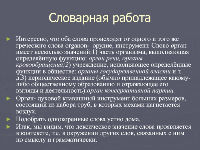 греческого слова organon- орудие, инструмент. Слово орган имеет несколько значений:1) часть организма, выполняющая определённую функцию: орган речи, органы кровообращения;2) учреждение, исполняющее определённые функции в обществе: органы государственной власти и т.д.3) периодическое издание (обычно принадлежащее какому-либо общественному образованию и отражающее его взгляды и деятельность):орган консервативной партии.
