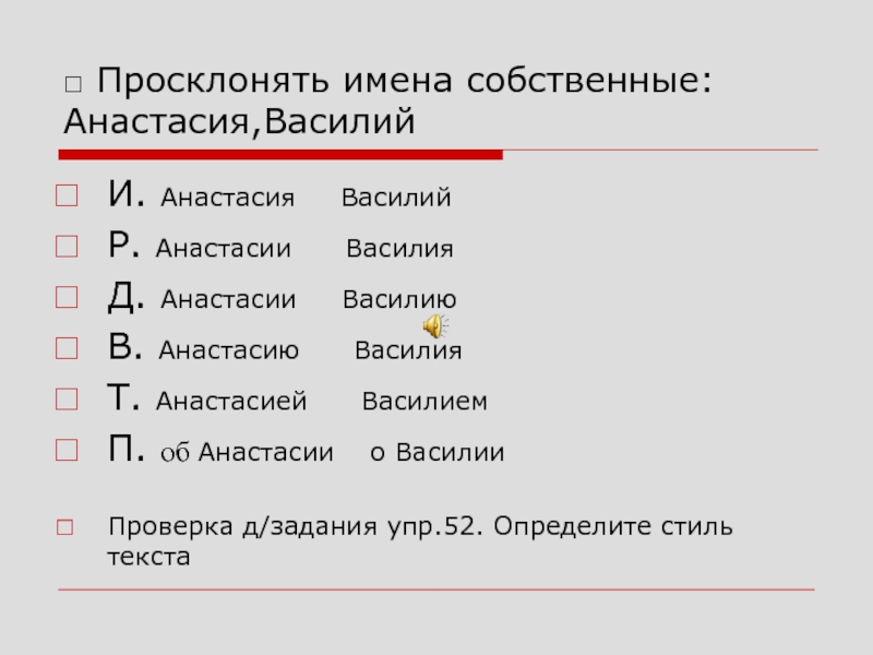 Слайд 2□ Просклонять имена собственные:Анастасия,Василий