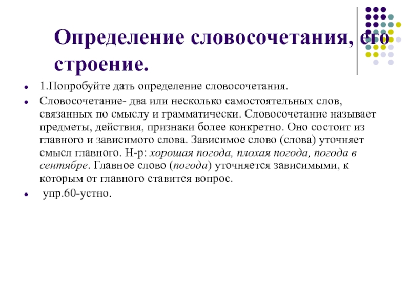 слов, связанных по смыслу и грамматически. Словосочетание называет предметы, действия, признаки более конкретно. Оно состоит из главного и зависимого слова. Зависимое слово (слова) уточняет смысл главного. Н-р: хорошая погода, плохая погода, погода в сентябре. Главное слово (погода) уточняется зависимыми, к которым от главного ставится вопрос.