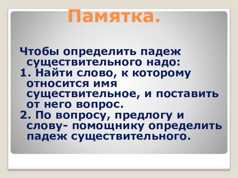 2. По вопросу, предлогу и слову- помощнику определить падеж существительного.