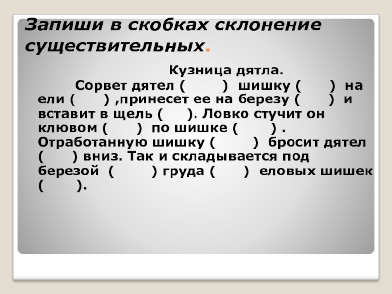 Сорвет дятел ( ) шишку ( ) на ели ( ) ,принесет ее на березу ( ) и вставит в щель ( ). Ловко стучит он клювом ( ) по шишке ( ) . Отработанную шишку ( ) бросит дятел ( ) вниз. Так и складывается под березой ( ) груда ( ) еловых шишек ( ).