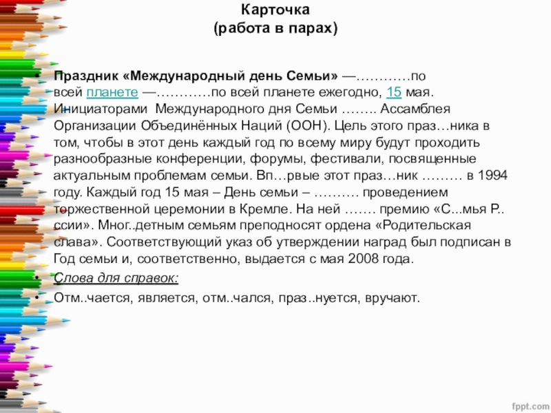 дня Семьи …….. Ассамблея Организации Объединённых Наций (ООН). Цель этого праз…ника в том, чтобы в этот день каждый год по всему миру будут проходить разнообразные конференции, форумы, фестивали, посвященные актуальным проблемам семьи. Вп…рвые этот праз…ник ……… в 1994 году. Каждый год 15 мая – День семьи – ………. проведением торжественной церемонии в Кремле. На ней ……. премию «С...мья Р..ссии». Мног..детным семьям преподносят ордена «Родительская слава». Соответствующий указ об утверждении наград был подписан в Год семьи и, соответственно, выдается с мая 2008 года.