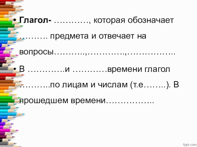 Слайд 5Глагол- …………, которая обозначает ………. предмета и отвечает на вопросы………..,………….,……………..