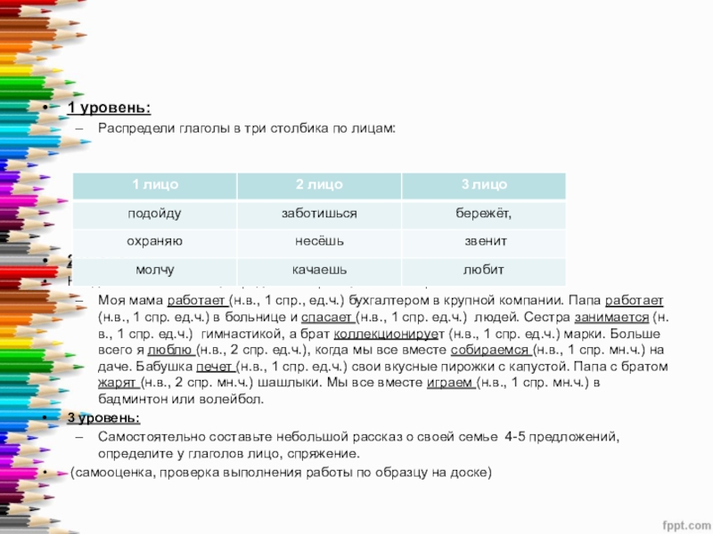 Самостоятельно составьте небольшой рассказ о своей семье 4-5 предложений, определите у глаголов лицо, спряжение.