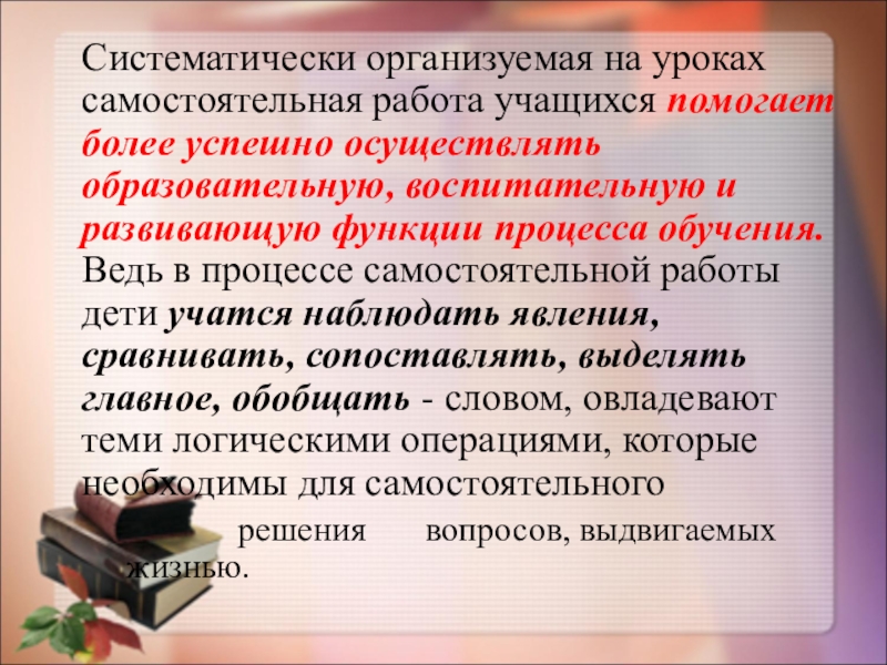 образовательную, воспитательную и развивающую функции процесса обучения. Ведь в процессе самостоятельной работы дети учатся наблюдать явления, сравнивать, сопоставлять, выделять главное, обобщать - словом, овладевают теми логическими операциями, которые необходимы для самостоятельного