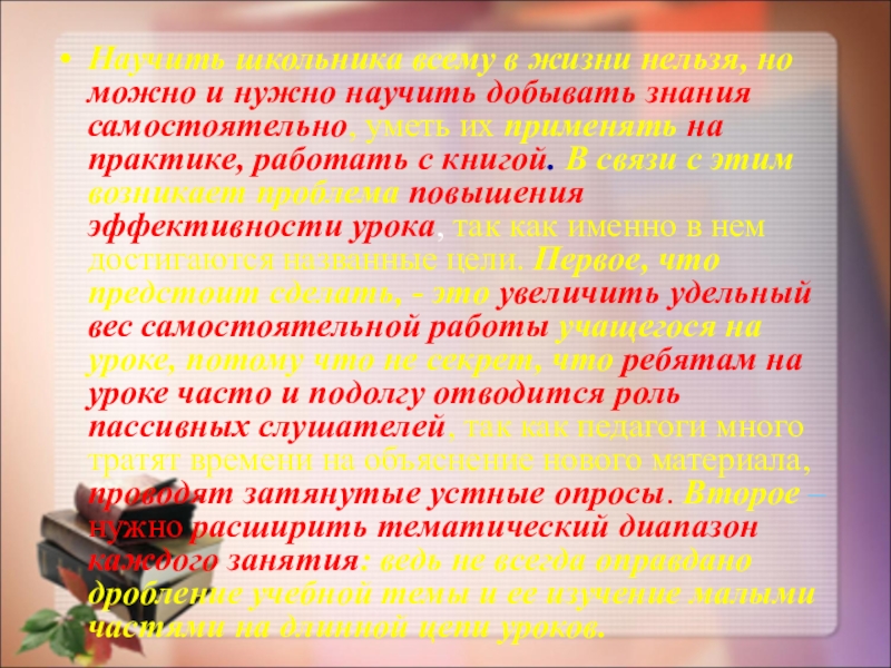 добывать знания самостоятельно, уметь их применять на практике, работать с книгой. В связи с этим возникает проблема повышения эффективности урока, так как именно в нем достигаются названные цели. Первое, что предстоит сделать, - это увеличить удельный вес самостоятельной работы учащегося на уроке, потому что не секрет, что ребятам на уроке часто и подолгу отводится роль пассивных слушателей, так как педагоги много тратят времени на объяснение нового материала, проводят затянутые устные опросы. Второе – нужно расширить тематический диапазон каждого занятия: ведь не всегда оправдано дробление учебной темы и ее изучение малыми частями на длинной цепи уроков.