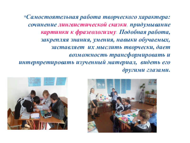 Слайд 15*Самостоятельная работа творческого характера: сочинение лингвистической сказки, придумывание картинки к фразеологизму.