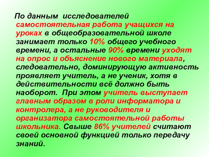 общеобразовательной школе занимает только 10% общего учебного времени, а остальные 90% времени уходят на опрос и объяснение нового материала, следовательно, доминирующую активность проявляет учитель, а не ученик, хотя в действительности всё должно быть наоборот. При этом учитель выступает главным образом в роли информатора и контролера, а не руководителя и организатора самостоятельной работы школьника. Свыше 86% учителей считают своей основной функцией только передачу знаний.
