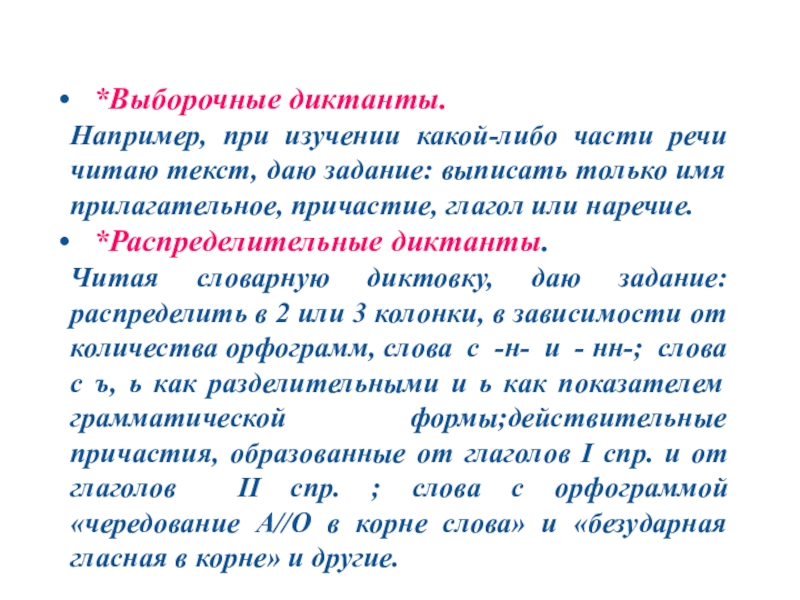 Читая словарную диктовку, даю задание: распределить в 2 или 3 колонки, в зависимости от количества орфограмм, слова с -н- и - нн-; слова с ъ, ь как разделительными и ь как показателем грамматической формы;действительные причастия, образованные от глаголов I спр. и от глаголов II спр. ; слова с орфограммой «чередование А//О в корне слова» и «безударная гласная в корне» и другие.