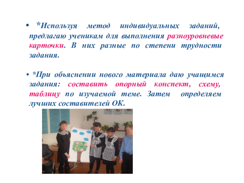 Слайд 14 *Используя метод индивидуальных заданий, предлагаю ученикам для выполнения разноуровневые карточки.