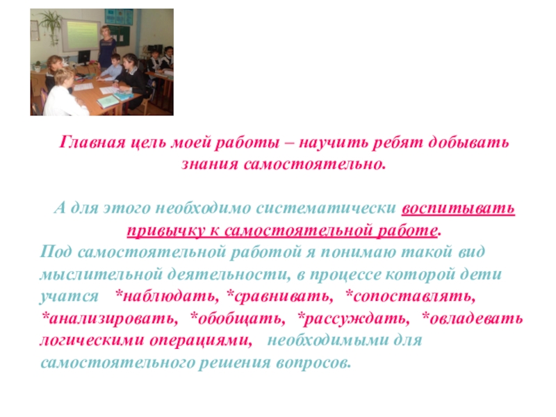 Под самостоятельной работой я понимаю такой вид мыслительной деятельности, в процессе которой дети учатся *наблюдать, *сравнивать, *сопоставлять, *анализировать, *обобщать, *рассуждать, *овладевать логическими операциями, необходимыми для самостоятельного решения вопросов.