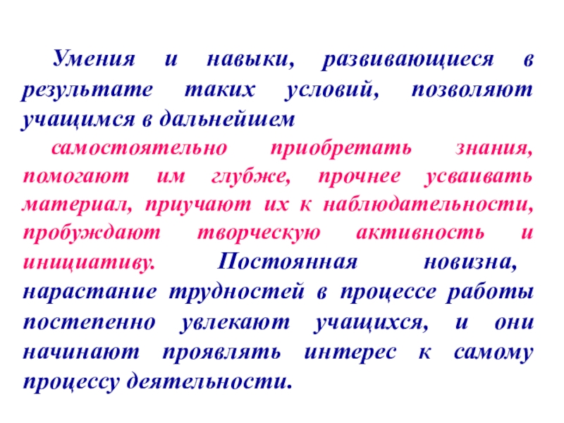 самостоятельно приобретать знания, помогают им глубже, прочнее усваивать материал, приучают их к наблюдательности, пробуждают творческую активность и инициативу. Постоянная новизна, нарастание трудностей в процессе работы постепенно увлекают учащихся, и они начинают проявлять интерес к самому процессу деятельности.
