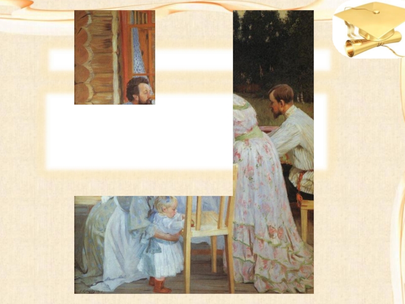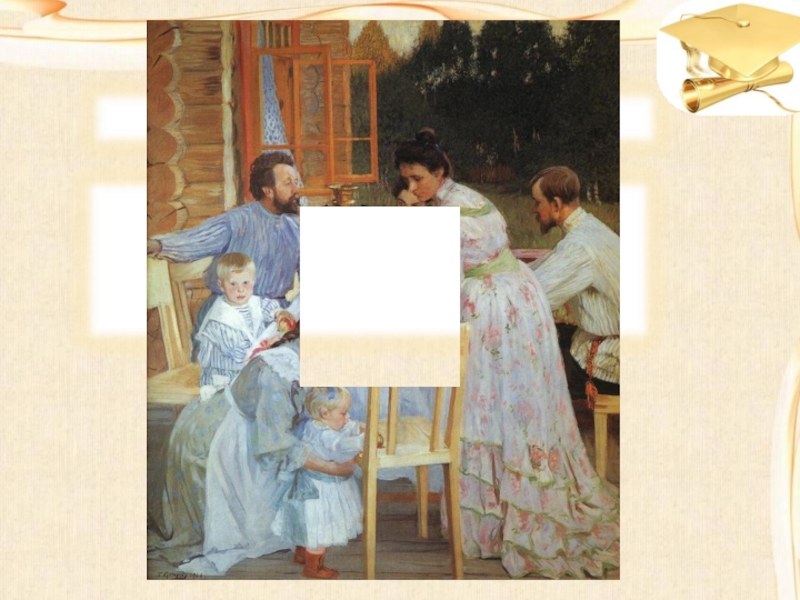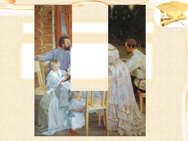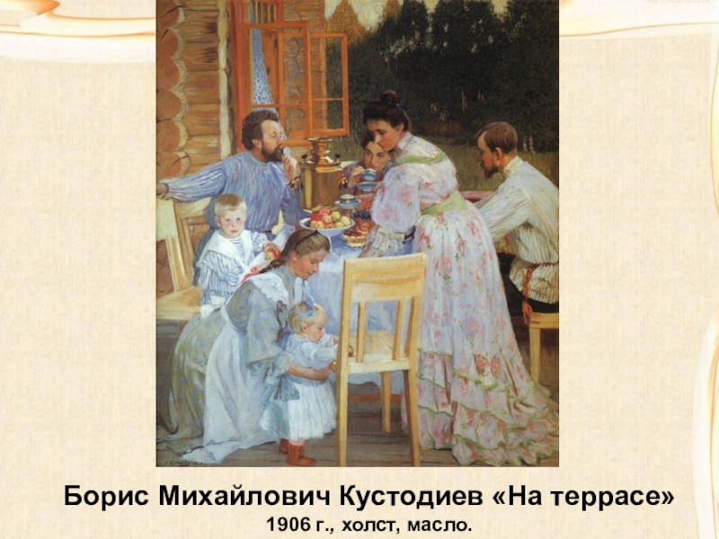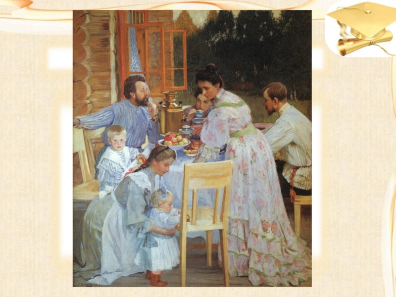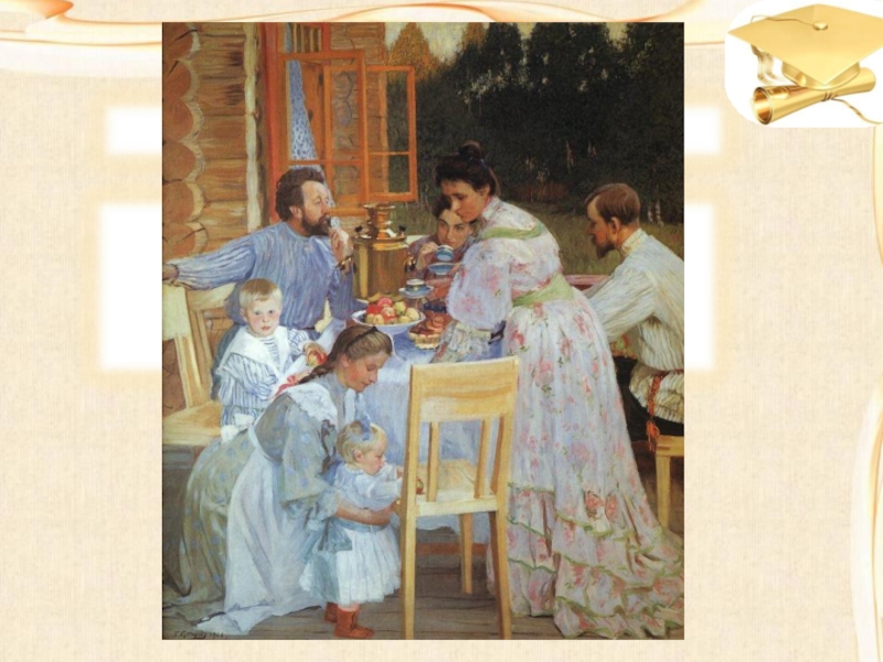 девятнадцатого и начала двадцатово веков. Большая семъя собралась за утреним чаем на свежем воздухе. Здесь же присудствуют и маленькие дети.