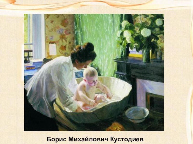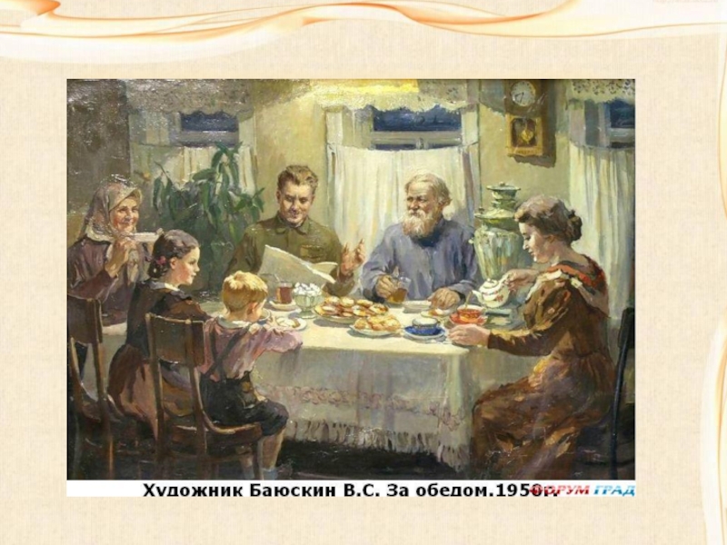 Жена Кустодиева, как и положено хозяйке, разливает чай. Она следит не только за гостями, но и успевает заметить, чем заняты ее дети. Она с заботой и любовью смотрит на свою дочь. Сам художник о чем-то задумался. В этой семье царит мир и покой, любовь и взаимопонимание. Картина наполнена семейным теплом, уютом и спокойствием.»