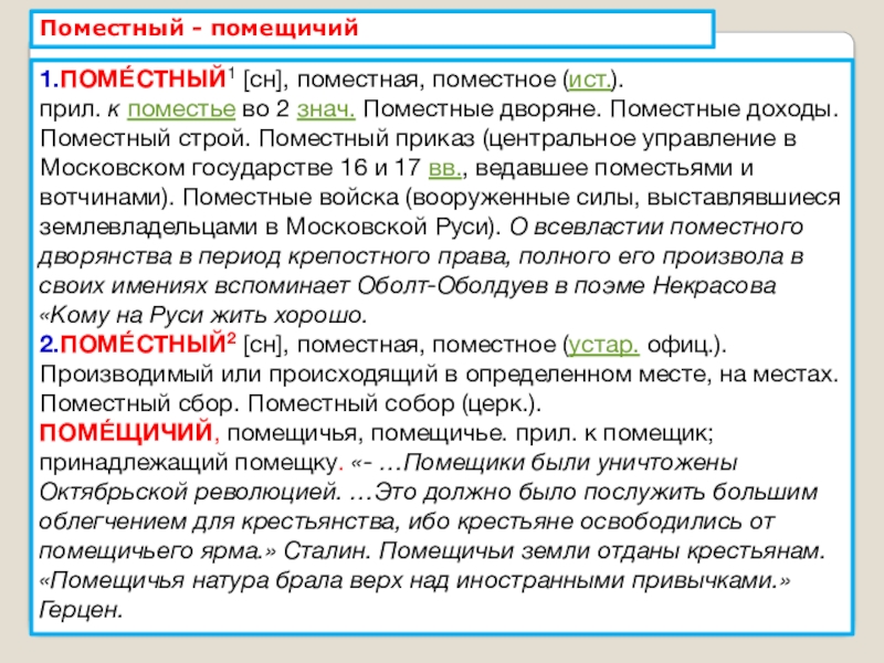 Поместный строй. Поместный приказ (центральное управление в Московском государстве 16 и 17 вв., ведавшее поместьями и вотчинами). Поместные войска (вооруженные силы, выставлявшиеся землевладельцами в Московской Руси). О всевластии поместного дворянства в период крепостного права, полного его произвола в своих имениях вспоминает Оболт-Оболдуев в поэме Некрасова «Кому на Руси жить хорошо.