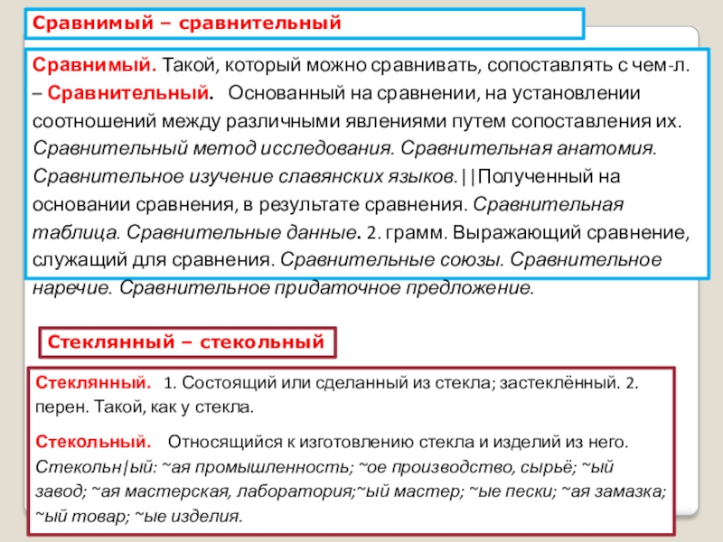 – Сравнительный. Основанный на сравнении, на установлении соотношений между различными явлениями путем сопоставления их. Сравнительный метод исследования. Сравнительная анатомия. Сравнительное изучение славянских языков.||Полученный на основании сравнения, в результате сравнения. Сравнительная таблица. Сравнительные данные. 2. грамм. Выражающий сравнение, служащий для сравнения. Сравнительные союзы. Сравнительное наречие. Сравнительное придаточное предложение.
