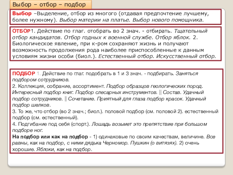 Выбрать – 1) Отобрать по какому-л. признаку, отдать предпочтение кому-л.,