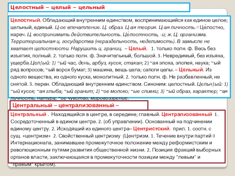 Центральный . Находящийся в центре, в середине; главный. Централизованный 1. Сосредоточенный в едином центре. 2. (об управлении). Основанный на подчинении единому центру. 2. Исходящий из единого центра– Центристский. прил. 1. соотн. с сущ. «центризм» 2. Свойственный центризму (Центризм. 1. Течение внутри партий II Интернационала, занимавшее промежуточное положение между реформистским и революционным путями развития общественной жизни. 2. Позиция фракций выборных органов власти, заключающаяся в промежуточности позиции между "левым" и "правым" крылом).