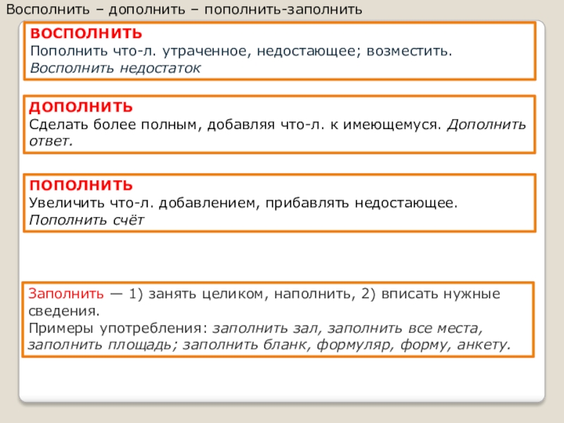 Слайд 4Восполнить – дополнить – пополнить-заполнить