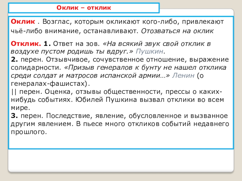 Отклик. 1. Ответ на зов. «На всякий звук свой отклик в воздухе пустом родишь ты вдруг.» Пушкин.